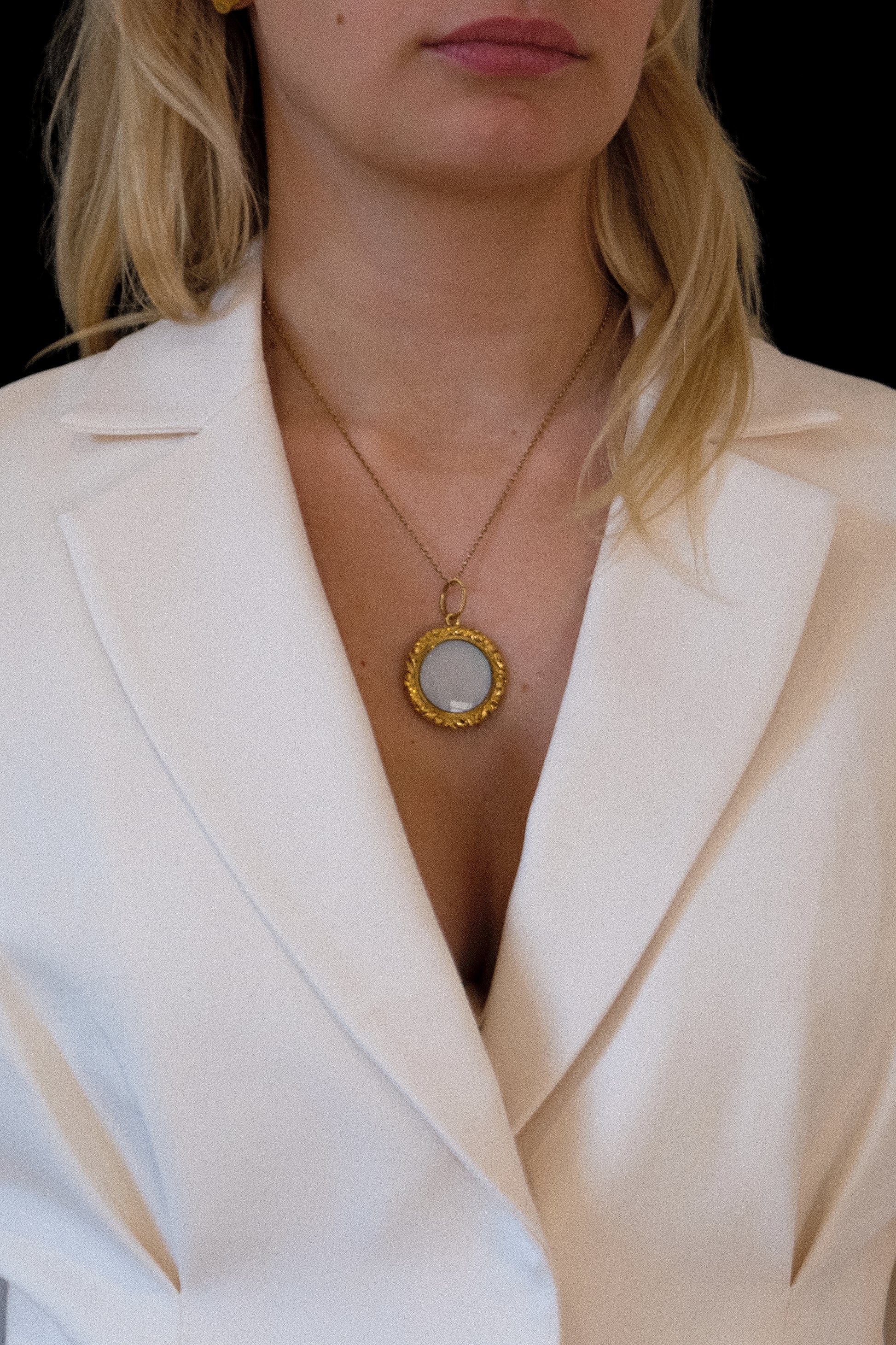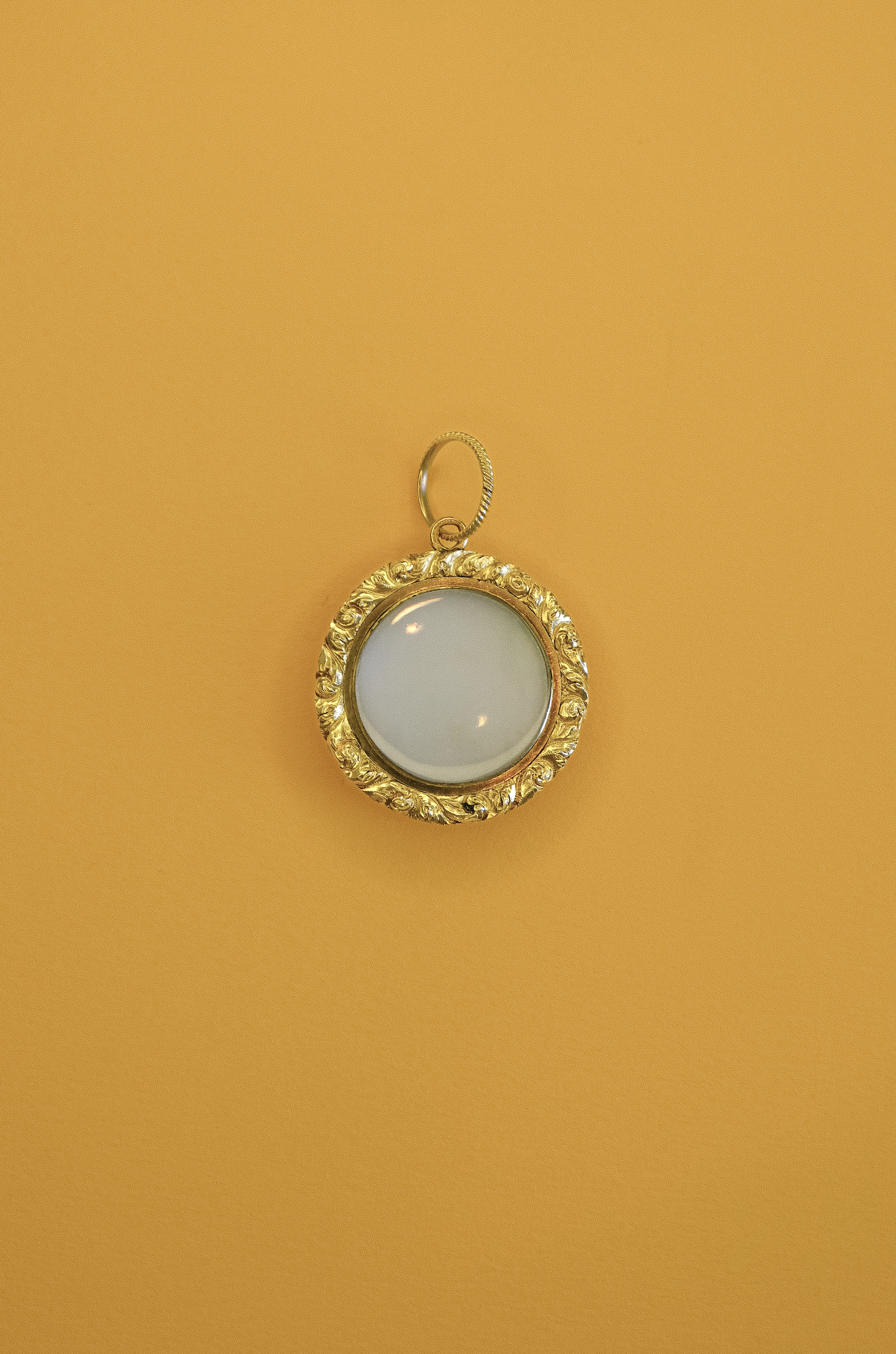 A substantial mid-19th-century medallion in rich 15ct yellow gold. The front is set with a raised floral cluster framed by fine engine-turned detailing, finished with an applied border of scrolling foliate goldwork.