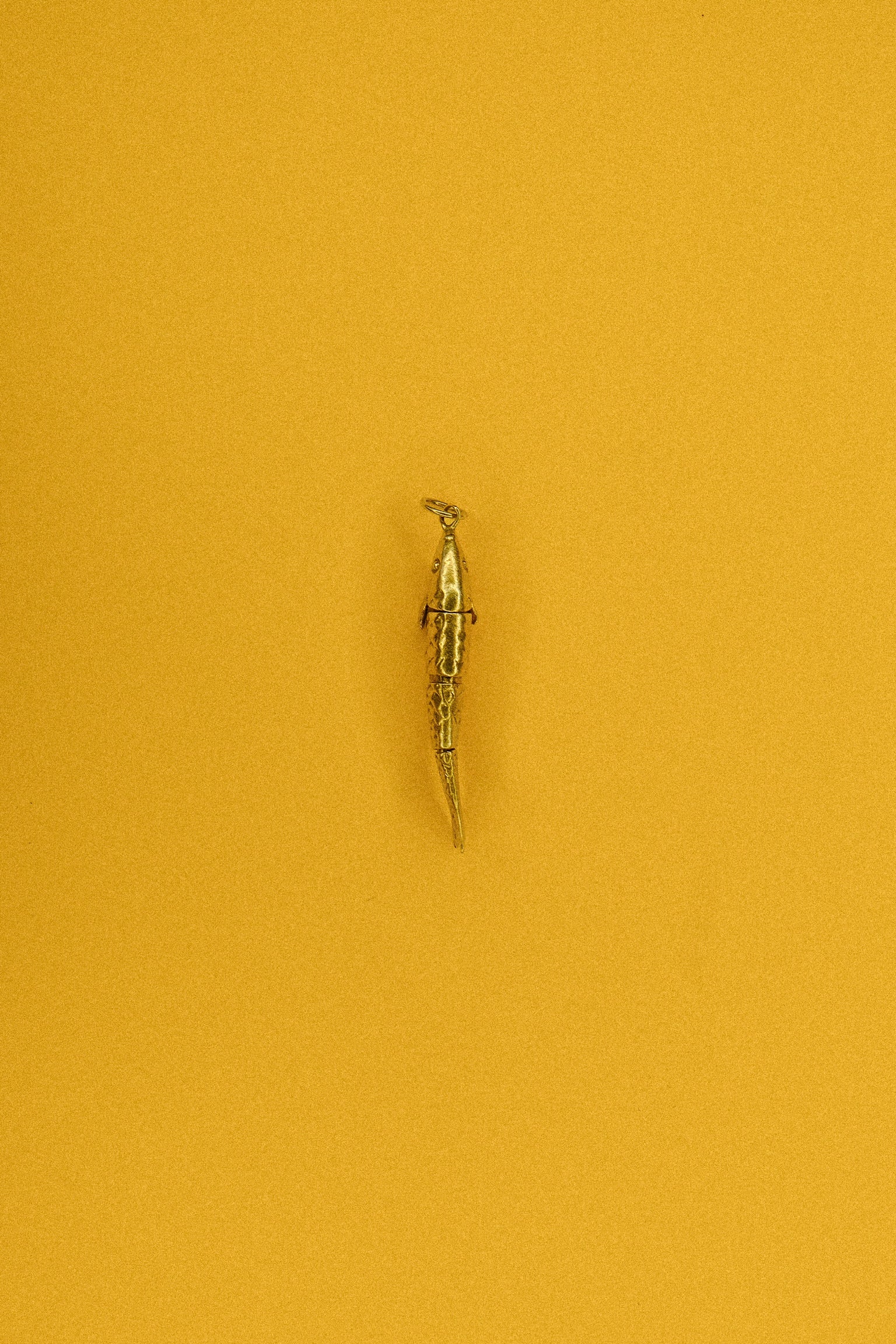 This Antique Lucky Fish Charm Necklace features a high carat gold charm with a unique, sectioned body that beautifully captures the movement of a swimming fish. It is delicately displayed on a gold chain necklace that adds a touch of elegance to any outfit. Not only is this necklace a cool conversation starter, but it also serves as an interesting and educational piece.