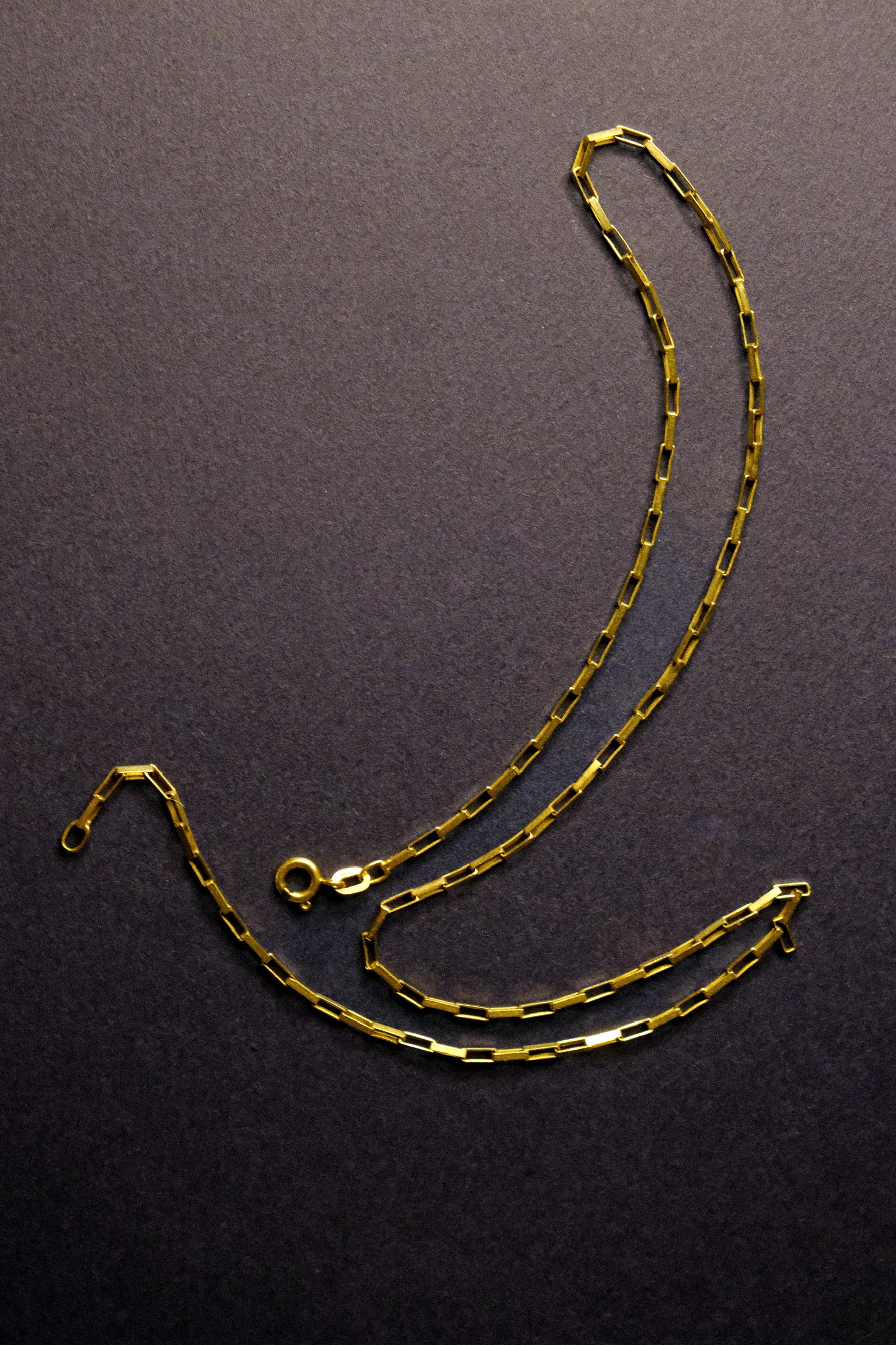 Expertly crafted from 9ct yellow gold, this stylish elongated box link chain boasts a unique geometric design and a secure bolt clasp for added peace of mind. Perfect for elevating any stack, this versatile piece adds an understated elegance to any outfit.